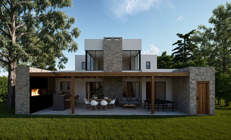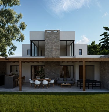 El living comedor en doble altura se plantea como el corazón de la casa: un espacio amplio, luminoso y protagonista, que articula la vida familiar y social.